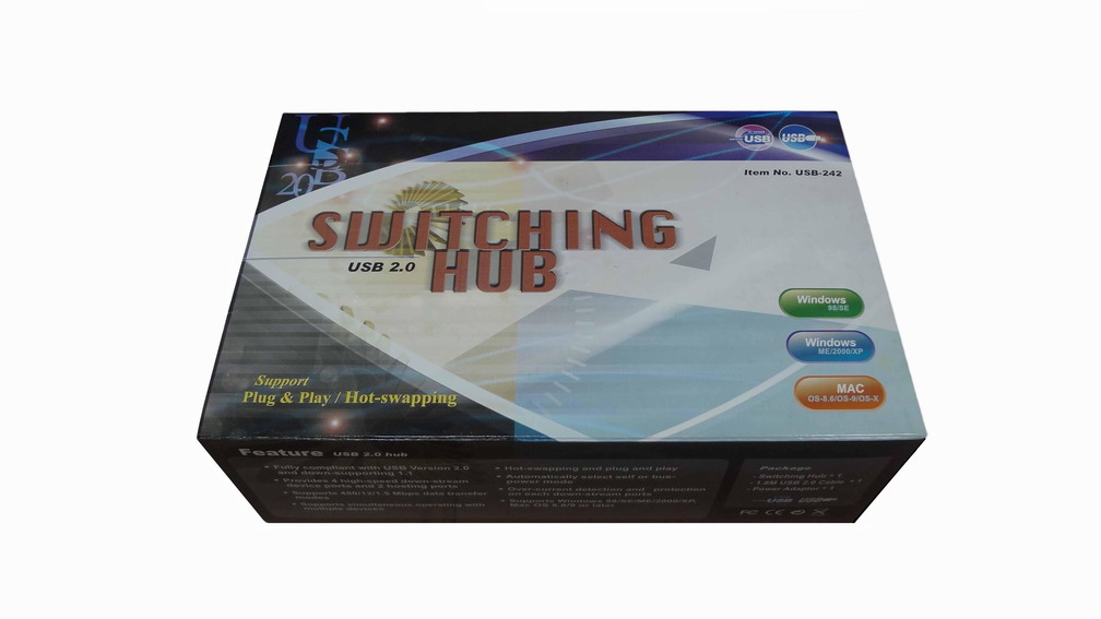 USB 2.0 switching hub offers a most cost, time, convenience, and efficiency-effective way to let two PC users co-use least 4 peripheral devices, like printer, scanner, card reader, CD burner, etc. Through USB connection, the friendly sharing environment is easily achieved.